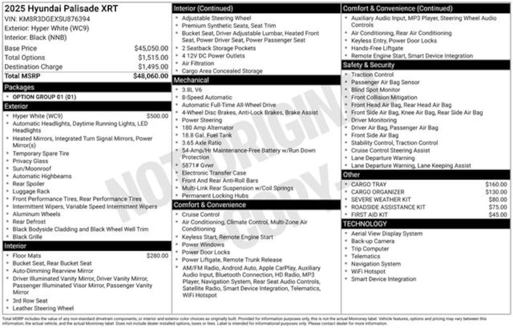 Certified. 2025 Hyper White 4D Sport Utility Hyundai Palisade XRT V6 AWD Navigation System, Option Group 01.