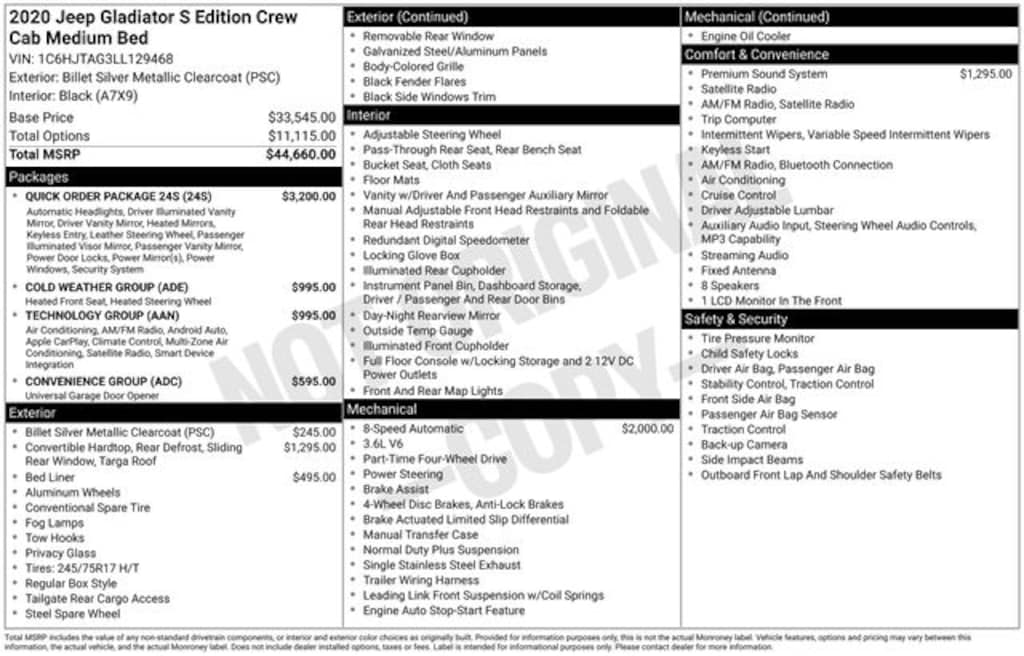 Gladiator Sport, 4D Crew Cab, 3.6L V6 24V VVT, 8-Speed Automatic, 4WD, Billet Silver Metallic Clearcoat, Black Cloth, 1-Year SiriusXM Radio Service, 7.0" Touch Screen Display, Air Conditioning w/Auto Temperature Control, Apple CarPlay, Automatic Headlamps, Cluster 7.0" TFT Color Display, Cold Weather Group, Convenience Group, Deep Tint Sunscreen Windows, For More Info, Call 800-643-2112, Front 1-Touch Down Power Windows, Google Android Auto, GPS Antenna Input, Heated Front Seats, Heated Steering Wheel, Integrated Center Stack Radio, Leather Wrapped Steering Wheel, Normal Duty Plus Suspension, Power Heated Mirrors, Power Tailgate Lock, Quick Order Package 24S, Radio: Uconnect 4 w/7" Display, Remote Keyless Entry, Security Alarm, SiriusXM Satellite Radio, Speed Sensitive Power Locks, Sun Visors w/Illuminated Vanity Mirrors, Technology Group, Universal Garage Door Opener, USB Host Flip, Wheels: 17" x 7.5" Tech Silver Aluminum. Clean CARFAX.