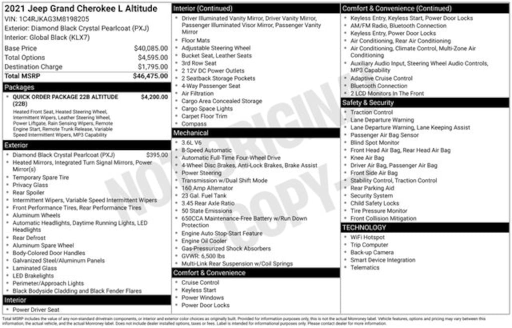 Certified. 2021 Diamond Black Crystal Pearlcoat 4D Sport Utility Jeep Grand Cherokee L Altitude 3.6L V6 24V VVT 4WD Grand Cherokee L Altitude, 4D Sport Utility, 3.6L V6 24V VVT, 8-Speed Automatic, 4WD, Diamond Black Crystal Pearlcoat, Black Leather, 115V Auxiliary Power Outlet, 3rd Row Charge-Only USB Ports, Altitude Appearance Package, Black Headliner, Bridgestone Brand Tires, Delete Laredo Badge, Gloss Black Exterior Accents, Heated Front Seats, Heated Steering Wheel, Leather Trimmed Bucket Seats, Leather Wrapped Steering Wheel, Molded In Color Black/Gloss Black Roof Rails, Power Liftgate, Quick Order Package 22B Altitude, Rain Sensitive Windshield Wipers, Remote Start System, Selectable Tire Fill Alert, Wheels: 20" x 8.5" Gloss Black Painted Aluminum, Wireless Charging Pad.