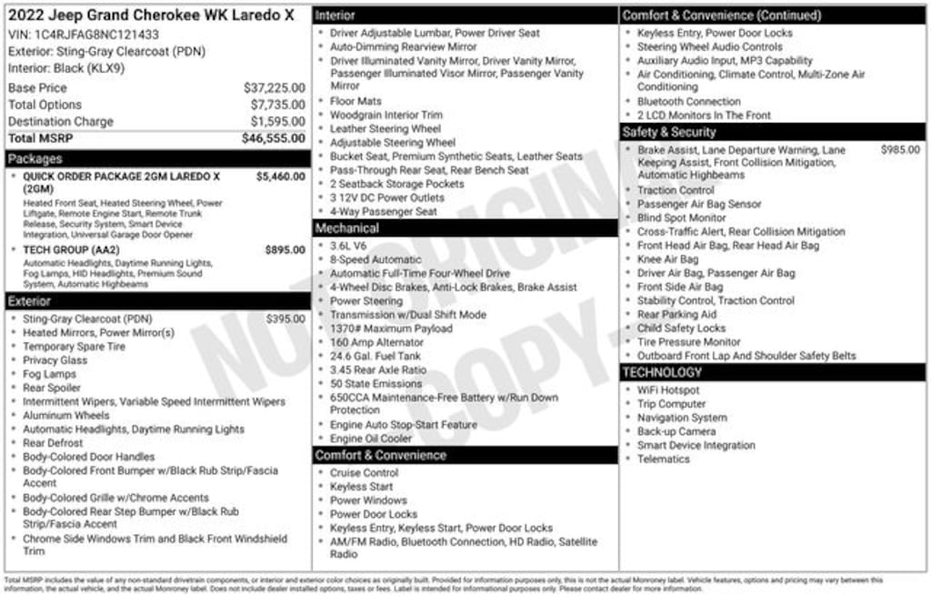Certified. 2022 Sting-Gray Clearcoat 4D Sport Utility Jeep Grand Cherokee WK Laredo X 3.6L V6 24V VVT 4WD 115V Auxiliary Power Outlet, 506 Watt Amplifier, Active Noise Control System, Advanced Brake Assist, Altitude Appearance Package, Altitude Grille, Auto High Beam Headlamp Control, Bi-Xenon High-Intensity Discharge Headlamps, Black Suede Seats w/Black Stitching, Body Color Claddings, Body Color Fascia, Body Color Shark Fin Antenna, Dark Day Light Opening Moldings, Dark Headlamp Bezel Finish, Dark Lens Taillamps, Delete Laredo Badge, Front Accent/Body Color Fascia, Front LED Fog Lamps, Full Speed FWD Collision Warn Plus, Gloss Black Jeep Badging, Gloss Black Rear Fascia Applique, Heated Front Seats, Heated Steering Wheel, Hill Descent Control, Lane Departure Warning Plus, LED Daytime Running Headlamps, Navigation System, Power Liftgate, Premium Alpine Speaker System, Protech II, Quadra-Trac II 4WD System, Quick Order Package 2GM Laredo X (DISC), Rear Accent/Body Color Fascia, Rear Fascia Black Molded in Color Step Pad, Remote Start System, Security Alarm, Selec-Terrain System, Single Exhaust w/Bright Tip, Steering Wheel Mounted Audio Controls, Tech Group, Universal Garage Door Opener, Wheels: 20" x 8.0" Gloss Black Aluminum.