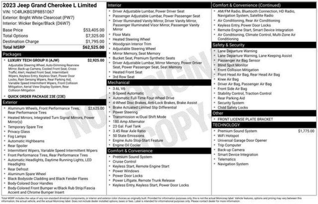 Certified. 2023 Bright White Clearcoat 4D Sport Utility Jeep Grand Cherokee L Limited 3.6L V6 24V VVT 4WD Grand Cherokee L Limited, 4D Sport Utility, 3.6L V6 24V VVT, 8-Speed Automatic, 4WD, Bright White Clearcoat, Wicker Beige/Black Artificial Leather, 2nd Row Manual Window Shades, Auto-Dimming Exterior Driver Mirror, Capri Leatherette w/Axis II Seats, Integrated Off-Road Camera, Intersection Collision Assist System, Luxury Tech Group II, Memory Steering Column, Navigation System, ParkSense Front/Rear Park Assist w/Stop, Passive Entry - Front/Rear Doors, Liftgate, Power Tilt/Telescope Steering Column, Quick Order Package 23E, Rain Sensitive Windshield Wipers, Rear Back Up Camera Washer, Rearview Autodim Digital Display Mirror, Surround View Camera System, Ventilated Front Seats, Wireless Charging Pad.