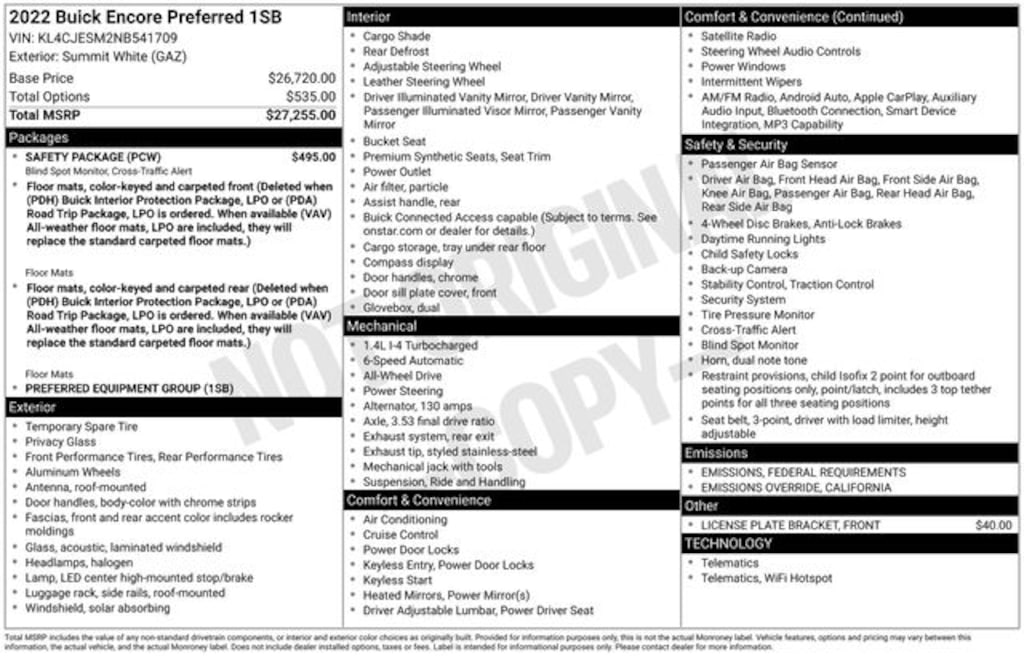 Encore Preferred, 4D Sport Utility, 1.4L ECOTEC Turbo VVT DOHC 4-Cyl SIDI, 6-Speed Automatic Electronic with Overdrive, AWD, Summit White, Ebony Cloth. CARFAX One-Owner. Clean CARFAX.