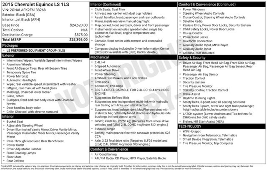 2015 Black 4D Sport Utility Chevrolet Equinox LS 2.4L 4-Cylinder SIDI DOHC VVT FWD Equinox LS, 4D Sport Utility, 2.4L 4-Cylinder SIDI DOHC VVT, 6-Speed Automatic with Overdrive, FWD, Black, Black Cloth.