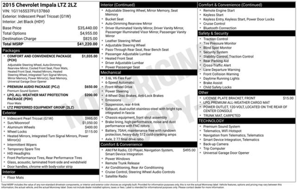 2015 Iridescent Pearl Tricoat 4D Sedan Chevrolet Impala LTZ 3.6L V6 DI DOHC FWD Impala LTZ 2LZ, 4D Sedan, 3.6L V6 DI DOHC, 6-Speed Automatic Electronic with Overdrive, FWD, Iridescent Pearl Tricoat, Black Leather, 120-Volt Power Outlet, All-Weather Mat Protection Package (LPO), Auto-Dimming Inside Rear-View Mirror, Black Fr & Rr Premium All-Weather Floor Mats (LPO), Bose Centerpoint Surround Sound w/11-Speakers, Carpeted Trunk Mat, Comfort & Convenience Package, Driver Memory, Heated Steering Wheel, Outside Heated Power-Adjustable Mirrors, Power Tilt & Telescoping Steering Column, Preferred Equipment Group 2LZ, Premium All-Weather Cargo Mat (LPO), Premium Audio Package, Premium Carpeted Front & Rear Floor Mats, Universal Home Remote, Ventilated Driver Seat, Ventilated Front Passenger Seat.