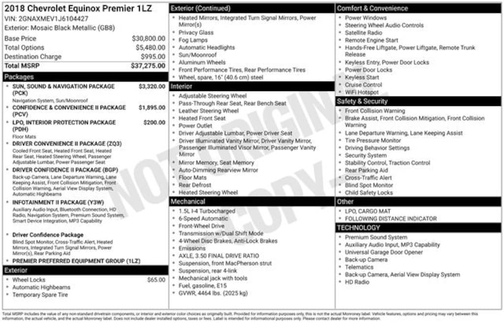 Equinox Premier, 4D Sport Utility, 1.5L DOHC, 6-Speed Automatic Electronic with Overdrive, FWD, Mosaic Black Metallic, Jet Black/Brandy Leather, 2 Rear USB Charging-Only Ports, 2 USB Data Ports, 2 USB Ports & Auxiliary Input Jack, 8-Way Power Front Passenger Seat Adjuster, All-Weather Floor Mats, Bird's Eye View Surround Vision, Bluetooth® For Phone, Bose Premium 7-Speaker Audio System Feature, Cargo Mat, Confidence & Convenience II Package, Driver Confidence II Package, Driver Convenience II Package, Following Distance Indicator, Forward Collision Alert, HD Radio, Heated Rear Seats, Heated Steering Wheel, Infotainment II Package, IntelliBeam Auto High Beam Headlamp Control, Interior Protection Package (LPO), Lane Keep Assist w/Lane Departure Warning, Low Speed Forward Automatic Braking, Power Sunroof, Preferred Equipment Group 1LZ, Radio: 8" Chevrolet MyLink AM/FM Stereo w/Nav, SiriusXM Satellite Radio, Sun, Sound & Navigation Package, Ventilated Driver Seat, Ventilated Front Passenger Seat, Wheels: 19" Ultra Bright Machined. Clean CARFAX.