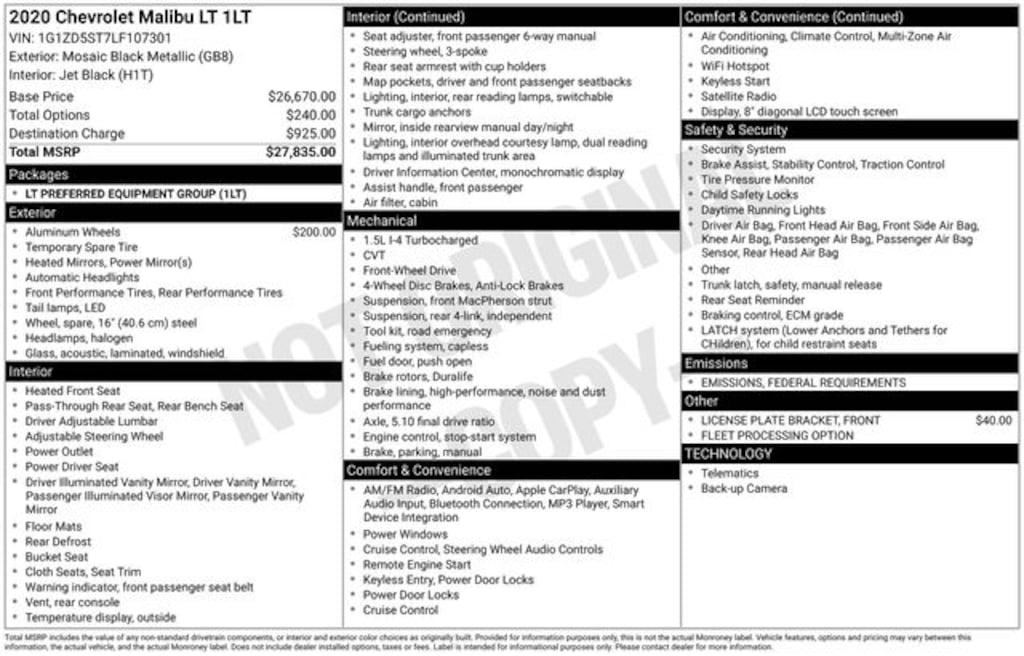 2020 Mosaic Black Metallic 4D Sedan Chevrolet Malibu LT 1.5L DOHC FWD Preferred Equipment Group 1LT.