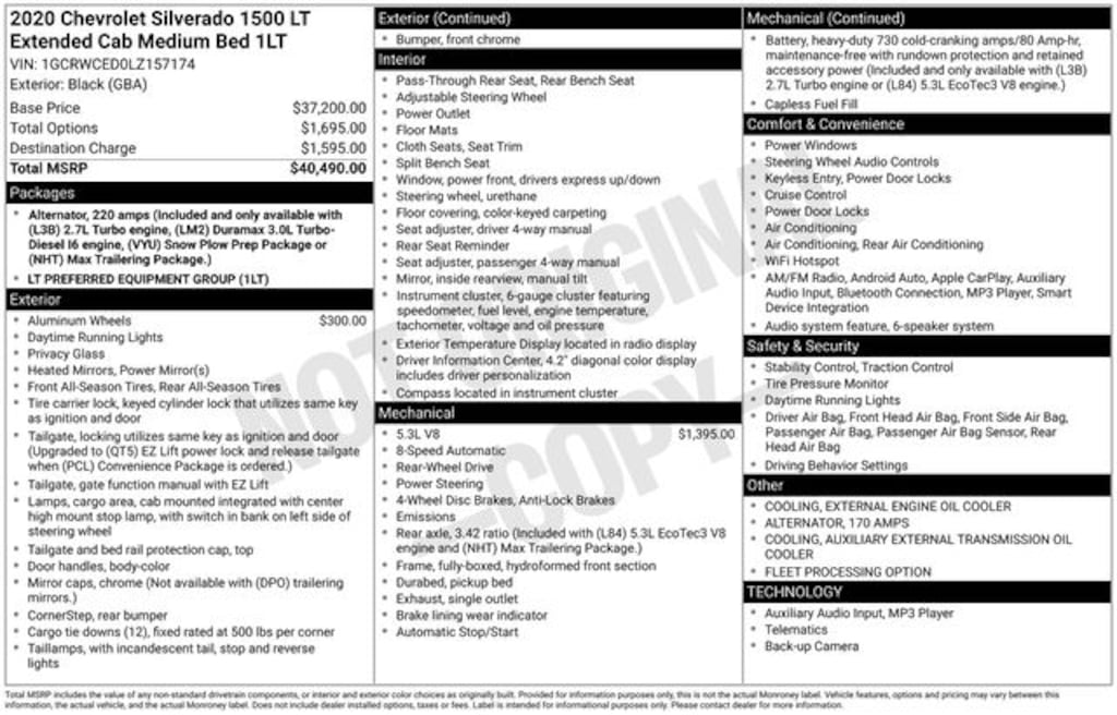 2020 Black 4D Double Cab Chevrolet Silverado 1500 LT EcoTec3 5.3L V8 RWD Silverado 1500 LT, 4D Double Cab, EcoTec3 5.3L V8, 8-Speed Automatic, RWD, Black, Gideon/Very Dark Atmosphere Cloth, 2 USB Ports (First Row), 4-Way Manual Driver Seat Adjuster, 4.2" Diagonal Color Display Driver Info Center, 4G LTE Wi-Fi Hot Spot Capable, Bluetooth® For Phone, Chevrolet Connected Access Capable, Chrome Grille, Chrome Mirror Caps, Color-Keyed Carpeting Floor Covering, Compass, Deep-Tinted Glass, Front Rubberized Vinyl Floor Mats, Locking Tailgate, Manual Tilt-Wheel Steering Column, OnStar & Chevrolet Connected Services Capable, Power Door Locks, Power Front Windows w/Driver Express Up/Down, Power Front Windows w/Passenger Express Down, Power Rear Windows w/Express Down, Preferred Equipment Group 1LT, Rear 60/40 Folding Bench Seat (Folds Up), Rear Rubberized-Vinyl Floor Mats, Rear Vision Camera, Remote Keyless Entry, Single-Zone Manual/Semi-Automatic Air Conditioning, Steering Wheel Audio Controls, Steering Wheel Mounted Electronic Cruise Control, Urethane Steering Wheel, Wheels: 18" x 8.5" Bright Silver Painted Aluminum.
