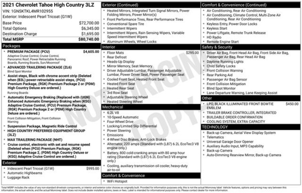 The Tahoe High Country's advanced technology and safety features provide unparalleled peace of mind. Enjoy the convenience of Adaptive Cruise Control, Enhanced Automatic Emergency Braking, and the stunning Dual-Pane Power Panoramic Sunroof. The 15-inch Diagonal Multi-Color Head-Up Display and Surround Vision Camera further enhance your driving experience.