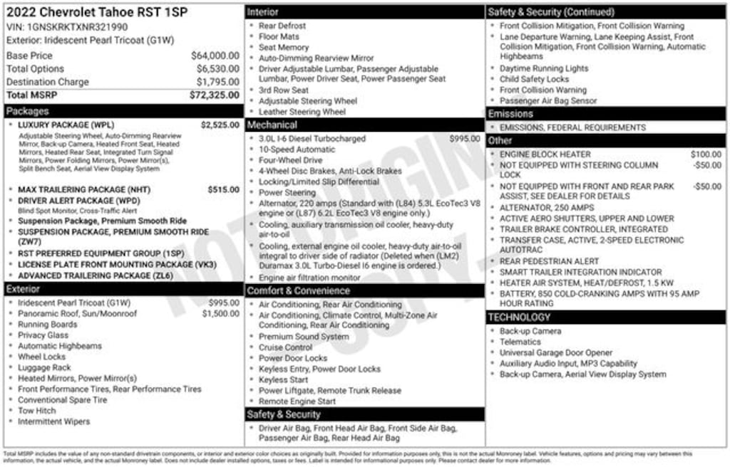 Introducing the 2022 Chevrolet Tahoe RST - a powerful and sophisticated SUV that's ready to elevate your driving experience. With its striking white exterior and impressive 3.0L I6 Duramax diesel engine, this Tahoe RST is a true standout in its class.