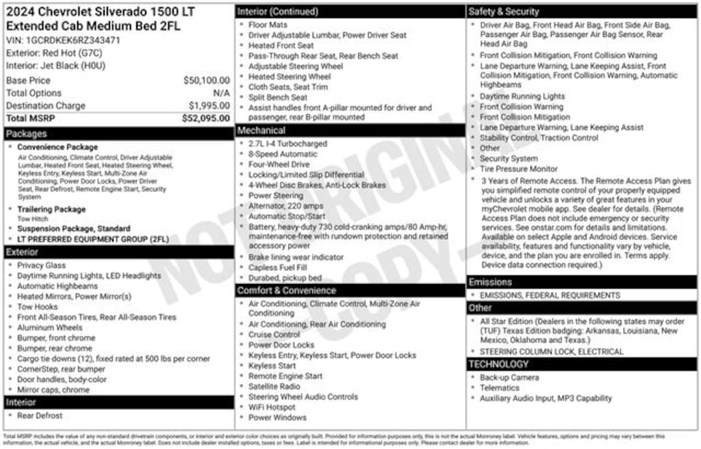 2024 Red Hot 4D Extended Cab Chevrolet Silverado 1500 LT 2.7L I4 Turbocharged DOHC 16V LEV3-SULEV30 310hp 4WD 10-Way Power Driver Seat w/Lumbar, 120-Volt Bed Mounted Power Outlet, 120-Volt Interior Power Outlet, Convenience Package, Dual Rear USB Ports (Charge Only), Dual-Zone Automatic Climate Control, Heated Driver & Front Outboard Passenger Seats, Heated Steering Wheel, Hitch Guidance, Keyless Open & Start, Standard Suspension Package, Trailering Package, Wrapped Steering Wheel.