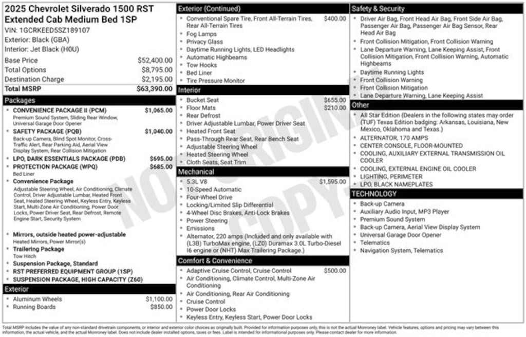 2025 Black 4D Extended Cab Chevrolet Silverado 1500 RST EcoTec3 5.3L V8 4WD Silverado 1500 RST, 4D Extended Cab, EcoTec3 5.3L V8, 8-Speed Automatic, 4WD, Black, Black Cloth, 10-Way Power Driver Seat w/Lumbar, 12.3" Multicolor Reconfigurable Digital Display, 120-Volt Bed Mounted Power Outlet, 120-Volt Interior Power Outlet, 6-Speaker Audio System, All-Star Edition, Auto-Locking Rear Differential, Black Name Plates (LPO), Bluetooth® For Phone, Chevytec Spray-On Black Bedliner, Color-Keyed Carpeting Floor Covering, Convenience Package, Convenience Package II, Dark Essentials Package (LPO), Deep-Tinted Glass, Dual Rear USB Ports (Charge Only), Dual-Zone Automatic Climate Control, Electric Rear-Window Defogger, Electronic Cruise Control, EZ Lift Power Lock & Release Tailgate, Front Frame-Mounted Black Recovery Hooks, Front LED Fog Lamps, Front Rubberized Vinyl Floor Mats, HD Rear Vision Camera, HD Surround Vision, Heated Driver & Front Outboard Passenger Seats, Heated Power-Adjustable Outside Mirrors, Heated Steering Wheel, High Capacity Suspension Package, High Gloss Black Mirror Caps, Hitch Guidance, Hitch Guidance w/Hitch View, In-Vehicle Trailering System App, Inside Rear-View Mirror w/Tilt, Integrated Trailer Brake Controller, Keyless Open & Start, LED Cargo Area Lighting, Manual Tilt/Telescoping Steering Column, OnStar Services Capable, Perimeter Lighting, Power Front Windows w/Driver Express Up/Down, Power Front Windows w/Passenger Express Down, Power Rear Windows w/Express Down, Power Sliding Rear Window w/Rear Defogger, Preferred Equipment Group 1SP, Premium Bose 7-Speaker Sound System, Protection Package, Rear 60/40 Folding Bench Seat (Folds Up), Rear Cross Traffic Braking, Rear Pedestrian Alert, Rear Rubberized-Vinyl Floor Mats, Rear Wheelhouse Liners, Remote Vehicle Starter System, Safety Package, SiriusXM w/360L Trial Subscription, Standard Suspension Package, Standard Tailgate, Steering Wheel Audio Controls, Teen Driver, Theft Deterrent System (Unauthorized Entry), Tire Pressure Monitoring System, Trailer Camera Provisions, Trailer Side Blind Zone Alert, Trailering Package, Ultrasonic Front & Rear Park Assist, Universal Home Remote, Wi-Fi Hot Spot Capable, Wrapped Steering Wheel.