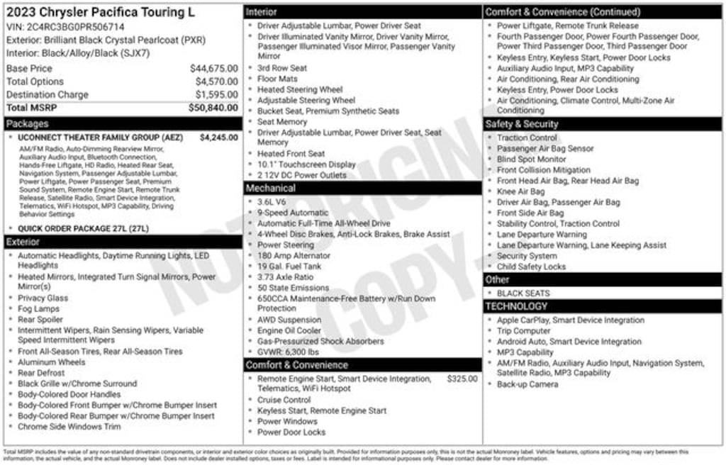 2023 Brilliant Black Crystal Pearlcoat 4D Passenger Van Chrysler Pacifica Touring L 3.6L V6 24V VVT AWD 10.1" Touchscreen Display, 115V Auxiliary Power Outlet, 13 Alpine Speakers, 220 Amp Alternator, 2nd & 3rd Row Window Shades, 3-Channel Video Remote Control, 3rd Row USB Charge Port, 4G LTE Wi-Fi Hot Spot, 506 Watt Amplifier, Amazon Fire TV Built-In, Apple CarPlay, Auto-Dimming Rear-View Mirror, Blu-Ray/DVD Player/USB Port, Connected Travel & Traffic Services, Disassociated Touchscreen Display, FamCAM Interior Camera, For Details, Visit DriveUconnect.com, Front Passenger Auto Advance N Return, Front/Rear 1-Touch Up/Down Power Windows, Global Telematics Box Module (TBM), Google Android Auto, GPS Antenna Input, GPS Navigation, Hands Free Power Liftgate, Hands Free Sliding Doors, HD Radio, Heated Second Row Seats, High Definition Multimedia Interface, Integrated Active Noise Cancellation, Integrated Center Stack Radio, Integrated Voice Command w/Bluetooth, KeySense, Power 2-Way Passenger Lumbar Adjust, Power Adjust 8-Way Front Passenger Seat, Quick Order Package 27L, Radio: Uconnect 5 Nav w/10.1" Display, Seatback Video Screens, SiriusXM Guardian - Included Trial (B), SiriusXM w/360L, Stow N Vac Integrated Vacuum, Uconnect Theater Family Group, USB Host Flip, Video USB Port.