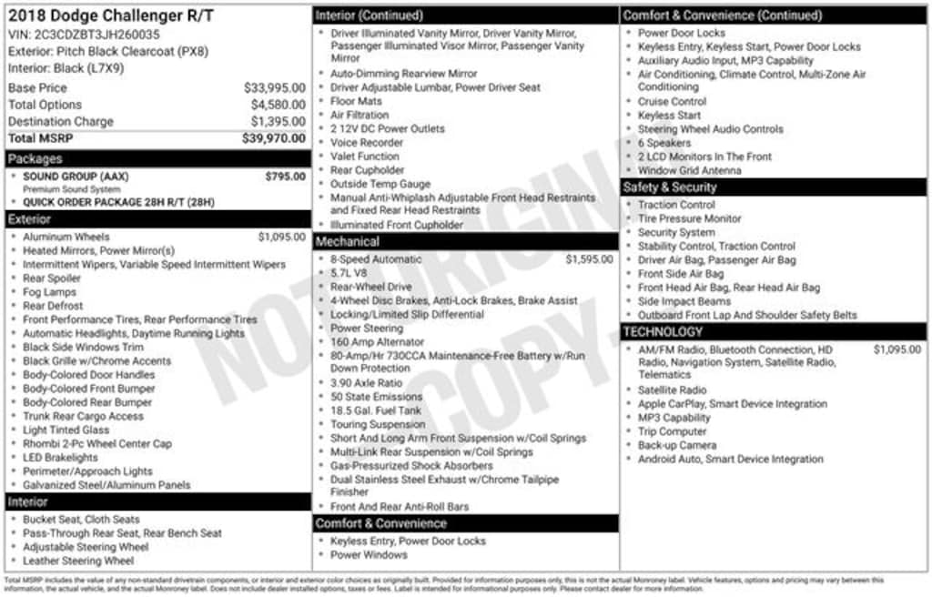 2018 Pitch Black Clearcoat 2D Coupe Dodge Challenger R/T HEMI 5.7L V8 Multi Displacement VVT RWD 276 Watt Amplifier, Quick Order Package 28H R/T, Sound Group.