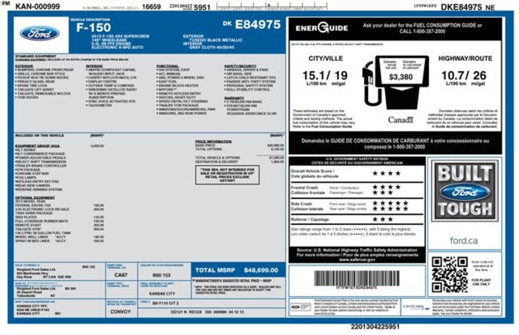2013 Black 4D SuperCrew Ford F-150 XLT 5.0L V8 FFV 4WD GVWR: 7,350 lbs Payload Package.
