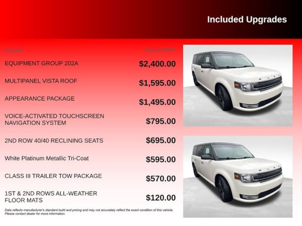 2019 White Platinum Clearcoat Metallic 4D Sport Utility Ford Flex SEL 3.5L V6 Ti-VCT AWD 110V/150W AC Power Outlet, 1st & 2nd Row Floor Mats, 20" Wheels, Adjustable Pedals w/Memory, Agate Black Painted Grille Center Bar, Agate Black Painted Roof, Agate Black Sideview Exterior Mirror Caps, Appearance Package, BLIS Blind Spot Information System, Class III Trailer Tow Package, Engine Oil Cooler, Equipment Group 202A, Leather-Trimmed Bucket Seats w/Perforated Inserts, Leather-Trimmed Heated Front Bucket Seats, Leather-Wrapped Steering Wheel, Memory Driver's Seat & Mirrors, Power Liftgate, Premium 7-Speaker Audio System, Security Approach Lamps, Unique Finish Door Trim Appliques, Unique Finish Instrument Panel, Universal Garage Door Opener (UGDO), Wheels: 20" High-Gloss Ebony Black.