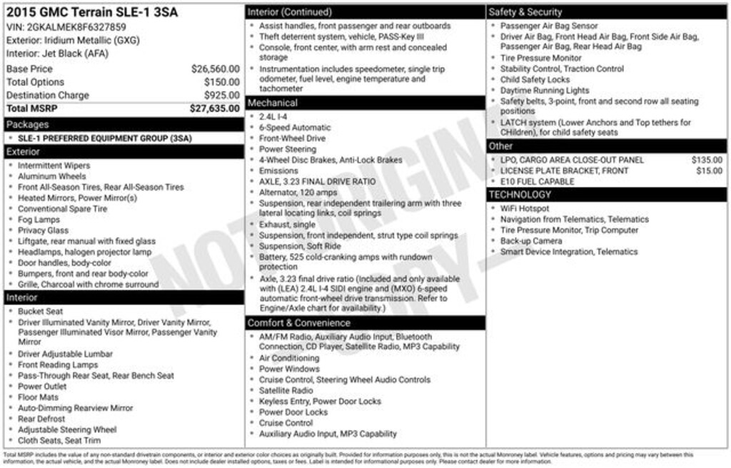 2015 Iridium Metallic 4D Sport Utility GMC Terrain SLE-1 2.4L 4-Cylinder SIDI DOHC VVT FWD Preferred Equipment Group 3SA, Single-Zone Manual Front Climate Control.
