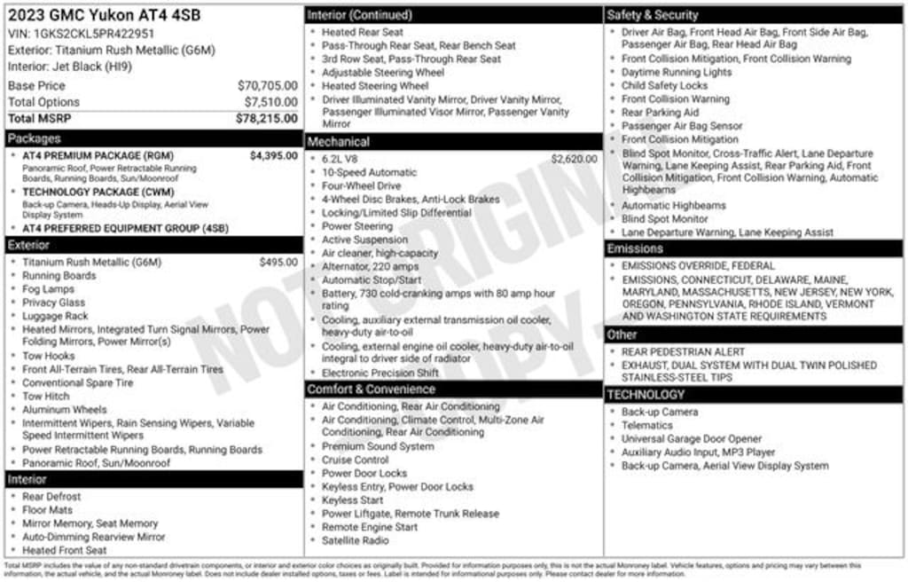 15" Diagonal Multi-Color Head-Up Display, 2 Presets For Outside Rearview Mirrors, 3 Years of GMC Connected Services, 3 Years of OnStar Safety & Security, 3rd Row 60/40 Power-Folding Split-Bench Seat, AT4 Premium Package, Black Roof-Mounted Luggage Rack Side Rails, Bose 9-Speaker Stereo Audio System Feature, Bright Front & Rear Door Sill Plates, Dual-Pane Panoramic Power Sunroof, Front High-Approach Angle Fascia, Hands-Free Power Programmable Rear Liftgate, HD Surround Vision, Heated & Ventilated Driver & Front Passenger Seats, Heated 2nd Row Outboard Position Seats, Heated Driver & Front Passenger Seats, Heated Steering Wheel, Heavy-Duty Air Filter, Hill Descent Control, Inside Rear-View Auto-Dimming Mirror, Navigation System, Outside Heated Power-Adjustable Mirrors, Power Release 2nd Row 60/40 Split-Folding Bench Seat, Power Tilt & Telescopic Steering Column, Power-Retractable Assist Steps, Preferred Equipment Group 4SB, Rear Pedestrian Alert, Red Horizontal-Mounted Recovery Hooks, Safety Alert Seat, Technology Package, Universal Home Remote, Wireless Charging. CARFAX One-Owner. Clean CARFAX.