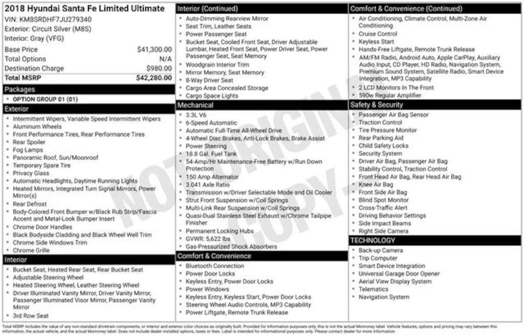 2018 Circuit Silver 4D Sport Utility Hyundai Santa Fe Limited Ultimate 3.3L V6 DGI DOHC 24V AWD Santa Fe Limited Ultimate, 4D Sport Utility, 3.3L V6 DGI DOHC 24V, 6-Speed Automatic with Shiftronic, AWD, Circuit Silver, Gray Leather.