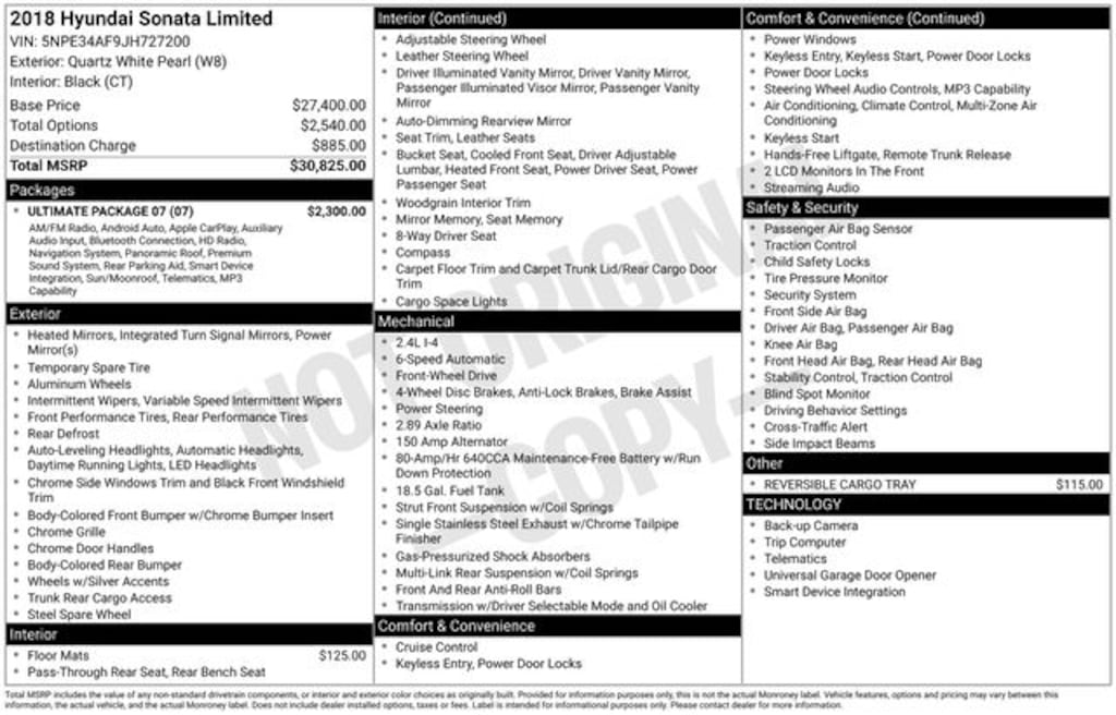 Sonata Limited, 4D Sedan, 2.4L I4 DGI DOHC 16V ULEV II 185hp, 6-Speed Automatic with Shiftronic, FWD, Quartz White Pearl, Black Leather, Automatic Emergency Braking (AEB), Automatic High Beam Assist, Electronic Parking Brake (EPB), Heated Steering Wheel, Lane Keep Assist System (LKA), Larger Front Brakes, Option Group 06, Smart Cruise Control w/Start/Stop, Sport Front Grille, Tech Package 06, Ultimate Package 07.