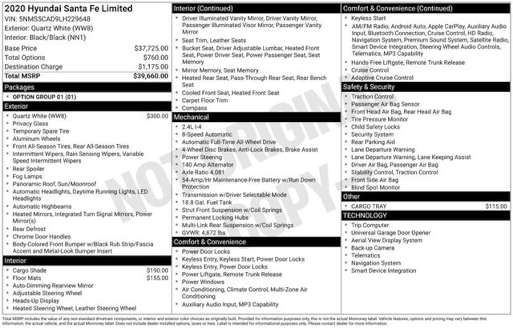 Powered by a robust 2.4L I4 engine and equipped with All-Wheel Drive, this Santa Fe delivers a thrilling and responsive performance, with an impressive fuel efficiency of 21 MPG in the city and 27 MPG on the highway. Whether you're navigating the daily commute or embarking on a weekend adventure, the Santa Fe's dynamic handling and ample cargo space make it the perfect companion.