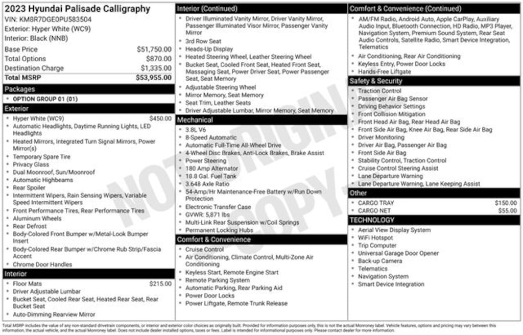 Certified. 2023 Hyper White 4D Sport Utility Hyundai Palisade Calligraphy V6 AWD Palisade Calligraphy, 4D Sport Utility, V6, 8-Speed Automatic with SHIFTRONIC, AWD, Hyper White, Black Leather, Navigation System, Option Group 01.