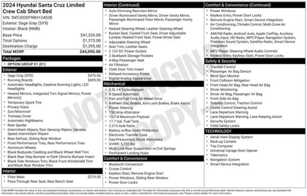Certified. 2024 Sage Gray 4D Crew Cab Hyundai Santa Cruz Limited 2.5L I4 AWD Navigation System, Option Group 01.