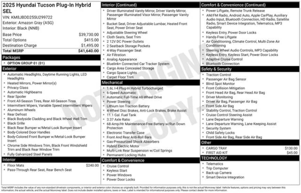 Certified. 2025 Amazon Gray 4D Sport Utility Hyundai Tucson Plug-In Hybrid SEL 1.6L I4 DGI Hybrid Turbocharged DOHC 16V LEV3-SULEV30 AWD Option Group 01.