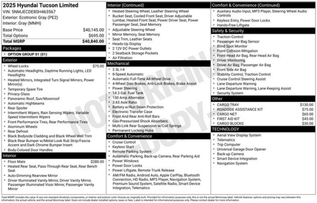 Tucson Limited, 4D Sport Utility, 2.5L I4 DGI DOHC 16V LEV3-SULEV30 187hp, 8-Speed Automatic with SHIFTRONIC, AWD, Ecotronic Gray, Gray Leather. CARFAX One-Owner. Clean CARFAX.