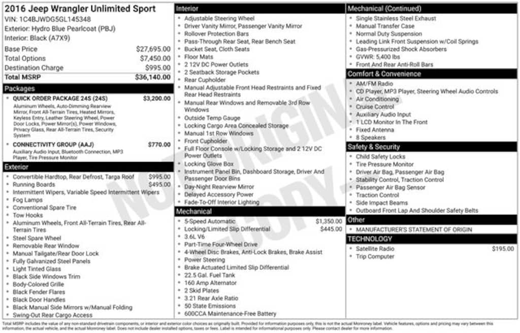 2016 Hydro Blue Pearl Coat 4D Sport Utility Jeep Wrangler Unlimited Sport 3.6L V6 24V VVT 4WD Wrangler Unlimited Sport, 4D Sport Utility, 3.6L V6 24V VVT, 5-Speed Automatic, 4WD, Hydro Blue Pearl Coat, Black Cloth.