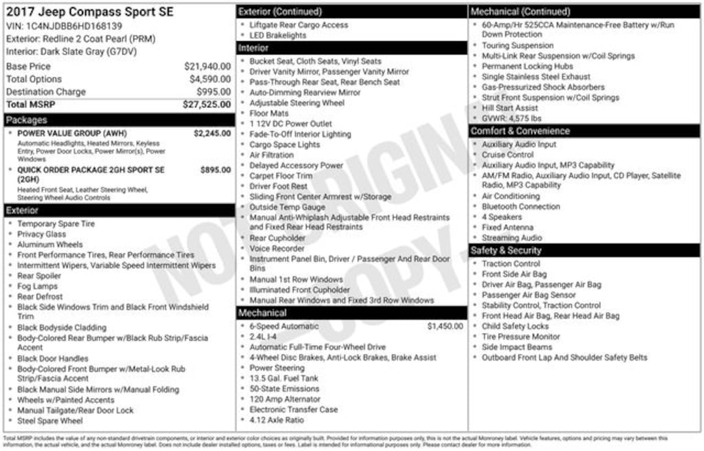 2017 Redline 2 Coat Pearl 4D Sport Utility Jeep Compass Sport 2.4L I4 DOHC 16V Dual VVT 4WD