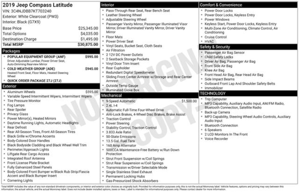 2019 White Clearcoat 4D Sport Utility Jeep Compass Latitude 2.4L I4 4WD Compass Latitude, 4D Sport Utility, 2.4L I4, 9-Speed Automatic, 4WD, White Clearcoat, Black Cloth.