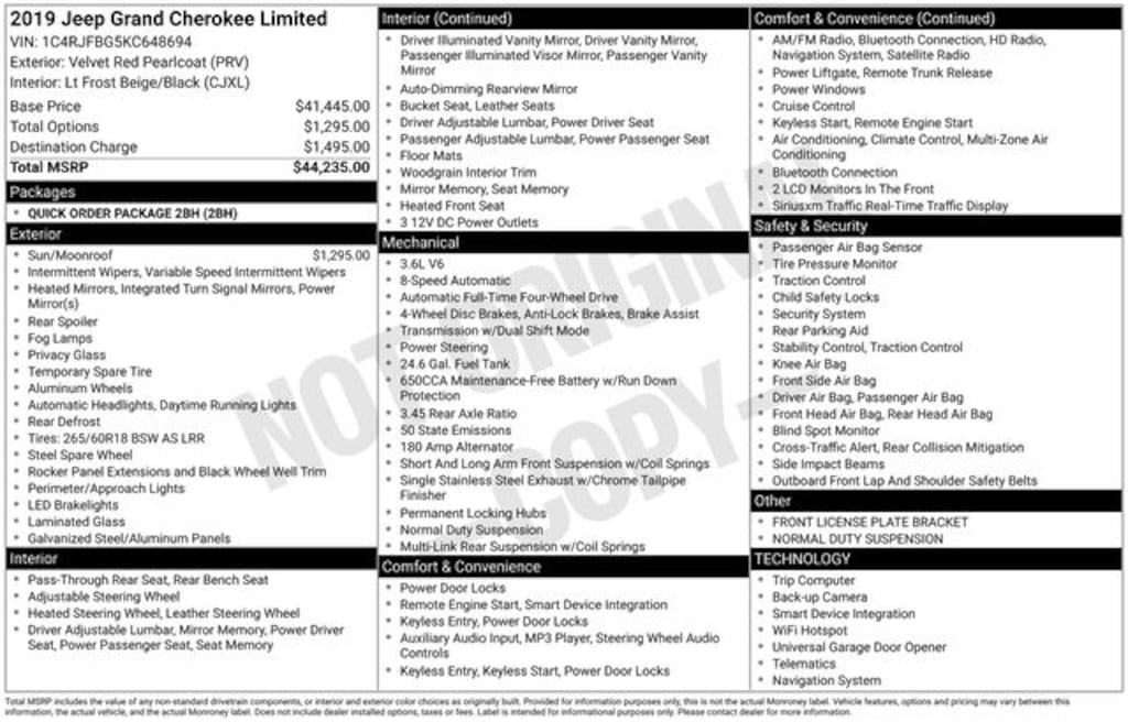2019 Velvet Red Pearlcoat 4D Sport Utility Jeep Grand Cherokee Limited 3.6L V6 24V VVT 4WD Quick Order Package 2BH.