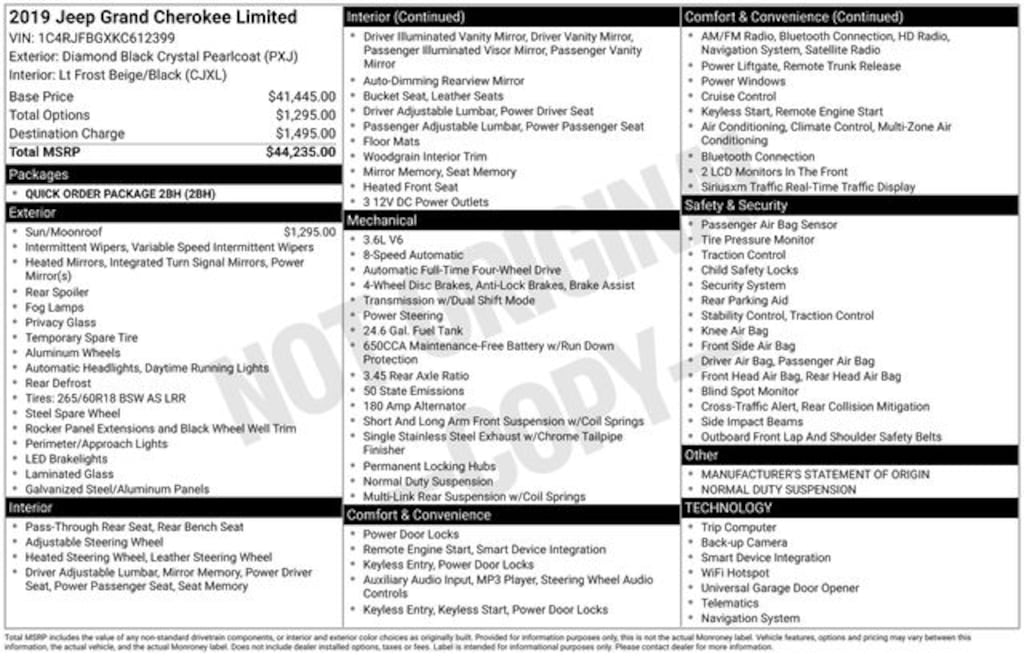 2019 Diamond Black Crystal Pearlcoat 4D Sport Utility Jeep Grand Cherokee Limited 3.6L V6 24V VVT 4WD Grand Cherokee Limited, 4D Sport Utility, 3.6L V6 24V VVT, 8-Speed Automatic, 4WD, Diamond Black Crystal Pearlcoat, Black Leather, Navigation System, Quick Order Package 2BH.