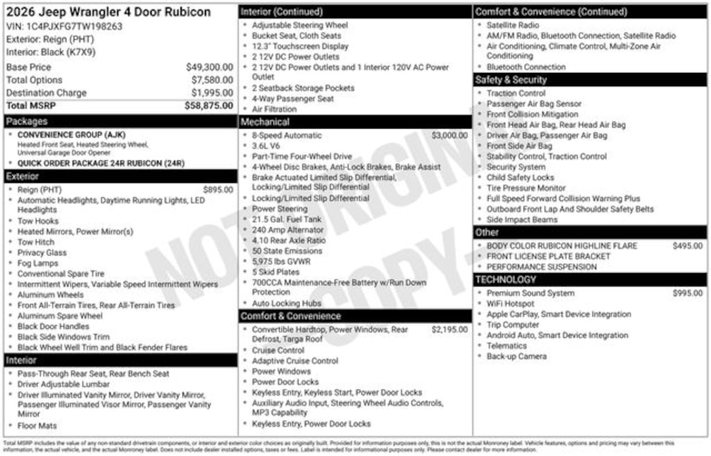 2026 Reign 4D Sport Utility Jeep Wrangler Rubicon 3.6L V6 24V VVT 4WD