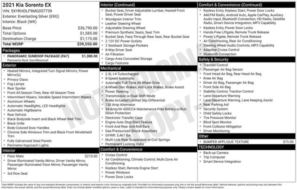 2021 Everlasting Silver 4D Sport Utility Kia Sorento EX 2.5L I4 DGI Turbocharged DOHC 16V LEV3-ULEV70 281hp AWD Panoramic Sunroof Package, Power Sunroof w/Power Sunshade.