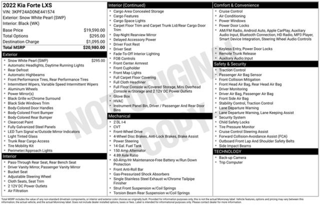 Forte LXS, 4D Sedan, 2.0L 4-Cylinder MPI, CVT, FWD, Snow White Pearl, Black Cloth. CARFAX One-Owner. Clean CARFAX.