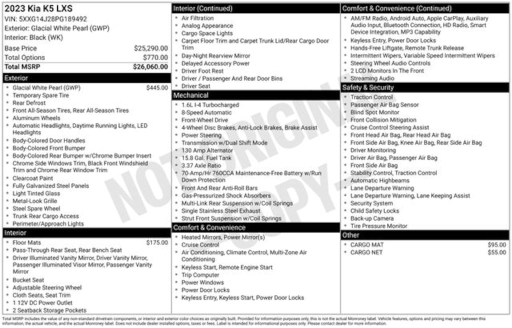 K5 LXS, 4D Sedan, 1.6L I4 DGI Turbocharged DOHC 16V LEV3-ULEV70 180hp, 8-Speed Automatic, FWD, Glacial White Pearl, Black Cloth. CARFAX One-Owner.