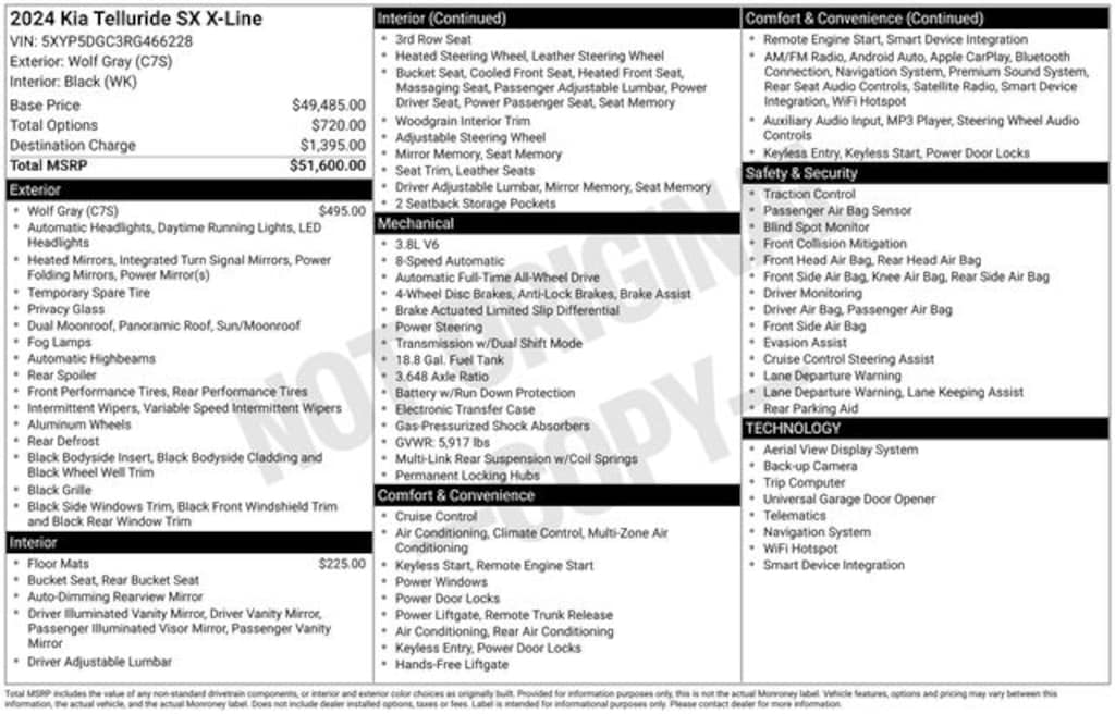 2024 Wolf Gray 4D Sport Utility Kia Telluride SX X-Line 3.8L V6 DOHC AWD Telluride SX X-Line, 4D Sport Utility, 3.8L V6 DOHC, 8-Speed Automatic, AWD, Wolf Gray, Black Leather, Navigation System.