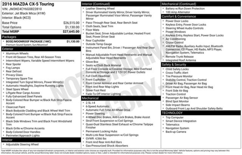CX-5 Touring, 4D Sport Utility, SKYACTIV® 2.5L 4-Cylinder DOHC 16V, 6-Speed Automatic, AWD, Jet Black Mica, Black Cloth.