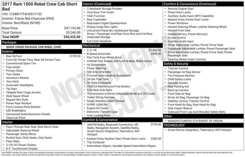 1500 Rebel, 4D Crew Cab, HEMI 5.7L V8 Multi Displacement VVT, 8-Speed Automatic, 4WD, Flame Red Clearcoat, Red/Black Cloth, 1 Yr. Trial (Registration Required), 5-Year SiriusXM Traffic Service, 5-Year SiriusXM Travel Link Service, 8.4" Touchscreen Display, Audio Jack Input for Mobile Devices, Dual Rear Exhaust w/Bright Tips, Flat Black 5.7L Hemi Badge, Flat Black Ram 1500 Badge, GPS Antenna Input, GPS Navigation, HD Radio, Integrated Voice Command w/Bluetooth, Media Hub (USB, AUX), Navigation System, Quick Order Package 26W Rebel, Radio: Uconnect 3C Nav w/8.4" Display, Ram Glove Box Badge, Remote keyless entry, Remote USB Port, SIRIUSXM Satellite Radio, SIRIUSXM Traffic, SiriusXM Travel Link, Uconnect Access, Uconnect Access 1 Year Trial. Clean CARFAX.