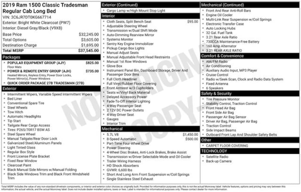 2019 Bright White Clearcoat 2D Standard Cab Ram 1500 Classic Tradesman HEMI 5.7L V8 Multi Displacement VVT 4WD 40/20/40 Split Bench Seat, Black Exterior Mirrors, Carpet Floor Covering, Cloth 40/20/40 Bench Seat, Exterior Mirrors w/Heating Element, Front Armrest w/3 Cupholders, Front Floor Mats, Manual Adjust Seats, Popular Equipment Group, Power & Remote Entry Group, Power Heated Fold-Away Mirrors, Power Locks, Power Windows w/Front 1-Touch Down, Premium Vinyl Door Trim w/Map Pocket, Quick Order Package 27B Tradesman, Remote Keyless Entry w/All-Secure, Tradesman Package.