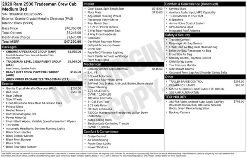 2 Way Rear Headrest Seat, 220 Amp Alternator, 4 Way Front Headrests, 40/20/40 Split Bench Seat, Bright Front Bumper, Bright Rear Bumper, Carpet Floor Covering, Chrome Appearance Group, Chrome Grille Surround, Cloth 40/20/40 Bench Seat, For More Info, Call 800-643-2112, Front Armrest w/Cupholders, Heavy Duty Snow Plow Prep Group, Manual Adjust 4-Way Driver Seat, Manual Adjust 4-Way Front Passenger Seat, Matte Black Mesh Grille w/Chrome, Quick Order Package 2ZA Tradesman, Rear Folding Seat, Rear Power Sliding Window, Rear Window Defroster, SiriusXM Radio Service, SiriusXM Satellite Radio, Tradesman Level 2 Equipment Group, Wheels: 18" x 8.0" Steel Chrome Clad.