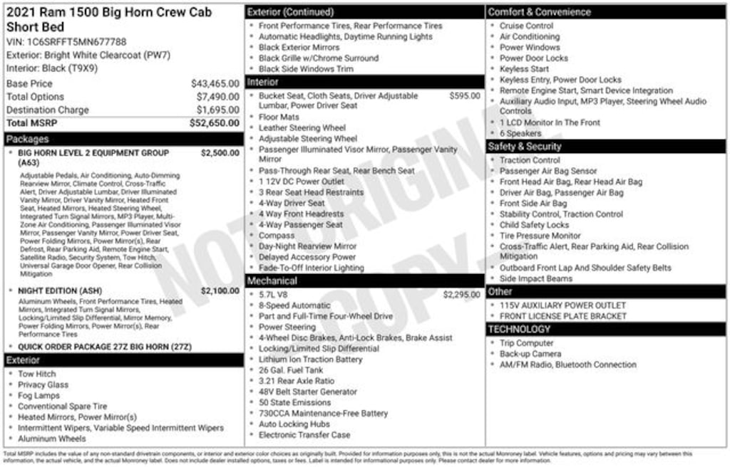 Certified. 2021 Bright White Clearcoat 4D Crew Cab Ram 1500 Big Horn/Lone Star HEMI 5.7L V8 Multi Displacement VVT 4WD 1500 Big Horn/Lone Star, 4D Crew Cab, HEMI 5.7L V8 Multi Displacement VVT, 8-Speed Automatic, 4WD, Bright White Clearcoat, Black Cloth, 115V Auxiliary Power Outlet, 115V Auxiliary Rear Power Outlet, 2nd Row In Floor Storage Bins, 3 Rear Seat Head Restraints, 4 Way Front Headrests, 400W Inverter, Accent Color Premium Power Mirrors, Air Conditioning ATC w/Dual Zone Control, Anti-Spin Differential Rear Axle, Auto-Dimming Exterior Driver Mirror, Auto-Dimming Rear-View Mirror, Big Horn Badge, Big Horn Level 2 Equipment Group, Black Exterior Truck Badging, Black Headlamp Bezels, Black Interior Accents, Black Painted Exterior Mirrors Caps, Black Premium Power Mirrors, Body Color Front Bumper, Body Color Rear Bumper w/Step Pads, Bucket Seats, Center Console Parts Module, Class IV Receiver Hitch, Cluster 7.0" TFT Color Display, Deluxe Cloth Bucket Seats, Dual Exhaust w/Black Tips, Exterior Mirrors Courtesy Lamps, Exterior Mirrors w/Memory, Exterior Mirrors w/Supplemental Signals, Foam Bottle Insert (Door Trim Panel), For More Info, Call 800-643-2112, Front Seat Back Map Pockets, Full Length Floor Console, Glove Box Lamp, Heated Front Seats, Heated Steering Wheel, Manual Adjust 4-Way Front Passenger Seat, Media Hub w/2 Charge Only USBs, Night Edition, ParkSense Front/Rear Park Assist w/Stop, Power 4-Way Driver Lumbar Adjust, Power 8-Way Driver Seat, Power Adjustable Pedals, Power-Folding Mirrors, Quick Order Package 27Z Big Horn, Rear 60/40 Folding Seat, Rear Dome w/On/Off Switch Lamp, Rear Power Sliding Window, Rear Window Defroster, Security Alarm, SiriusXM Radio Service, Sun Visors w/Illuminated Vanity Mirrors, Universal Garage Door Opener, Wheels: 20" x 9.0" Premium Paint/Polished.