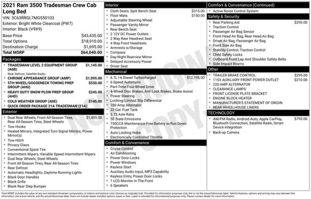 2021 Bright White Clearcoat 4D Crew Cab Ram 3500 Tradesman 6.7L I6 4WD 2 Way Rear Headrest Seat, 220 Amp Alternator, 4 Way Front Headrests, 40/20/40 Split Bench Seat, Bright Front Bumper, Bright Rear Bumper, Carpet Floor Covering, Chrome Appearance Group, Chrome Grille Surround, Cloth 40/20/40 Bench Seat, Cold Weather Group, Engine Block Heater, For More Info, Call 800-643-2112, Front Armrest w/Cupholders, Heavy Duty Snow Plow Prep Group, Manual Adjust 4-Way Driver Seat, Manual Adjust 4-Way Front Passenger Seat, Matte Black Mesh w/Chrome Grille, MOPAR Winter Front Grille Cover, Quick Order Package 21A Tradesman, Rear Folding Seat, Rear Power Sliding Window, Rear Window Defroster, SiriusXM Radio Service, SiriusXM Satellite Radio, Tradesman Level 2 Equipment Group.