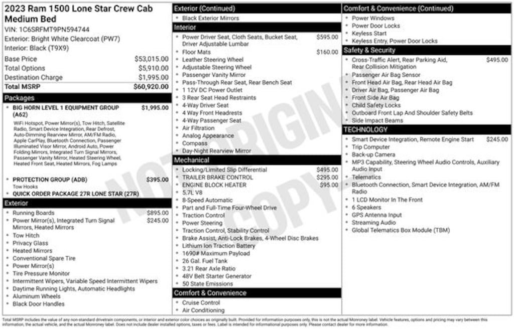 Certified. 2023 Bright White Clearcoat 4D Crew Cab Ram 1500 Big Horn/Lone Star HEMI 5.7L V8 Multi Displacement VVT eTorque 4WD 2nd Row In Floor Storage Bins, 4G LTE Wi-Fi Hot Spot, 8.4" Touchscreen Display, Apple CarPlay, Auto-Dimming Exterior Driver Mirror, Auto-Dimming Rear-View Mirror, Big Horn Level 1 Equipment Group, Black Exterior Mirrors, Black Premium Power Mirrors, Bluetooth Handsfree Phone & Audio, Class IV Receiver Hitch, Connectivity - US/Canada, Convex Wide-Angle Exterior Mirror Insert, Electric Shift-On-Demand Transfer Case, Exterior Mirrors Courtesy Lamps, Exterior Mirrors w/Heating Element, Exterior Mirrors w/Supplemental Signals, For Details, Visit DriveUconnect.com, For More Info, Call 800-643-2112, Front Fog Lamps, Glove Box Lamp, Google Android Auto, GPS Antenna Input, Heated Front Seats, Heated Steering Wheel, Integrated Center Stack Radio, Lone Star Badge, Passenger Sun Visor w/Illuminated Mirror, Power-Folding Mirrors, Protection Group, Quick Order Package 27R Lone Star (Regional), Radio: Uconnect 5 W w/8.4" Display, Rear Dome w/On/Off Switch Lamp, Rear Power Sliding Window, Rear Window Defroster, SiriusXM Satellite Radio, Tow Hooks, USB Host Flip.