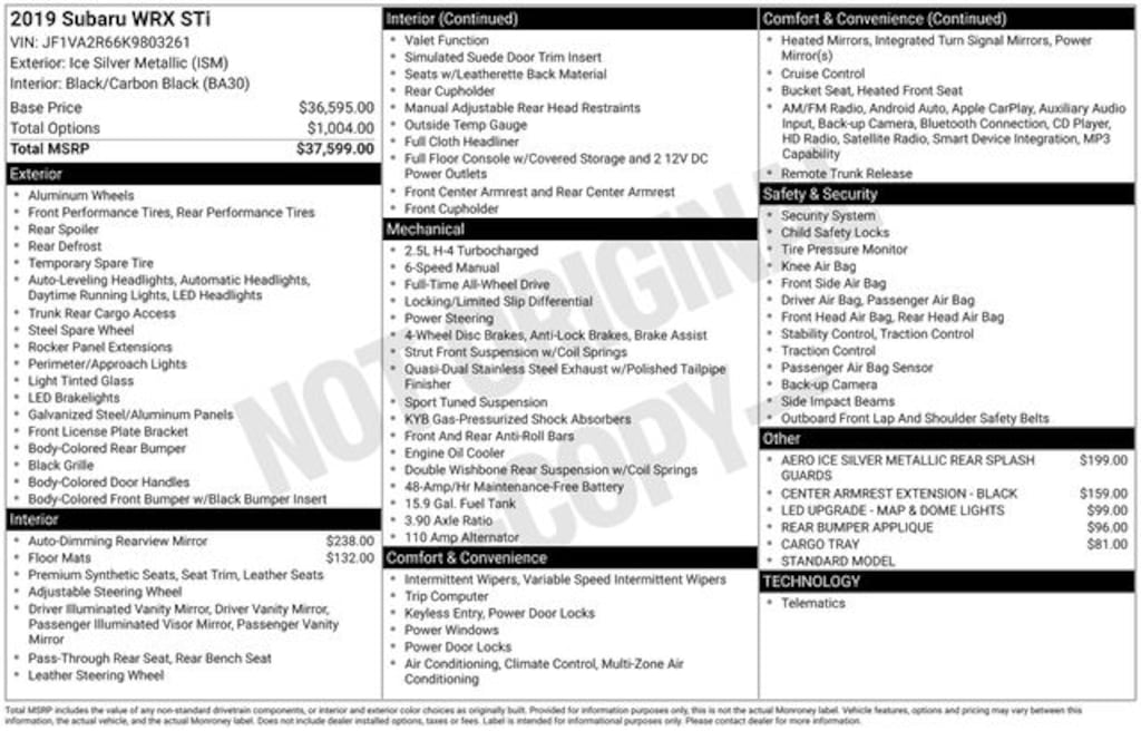 WRX STi, 4D Sedan, 2.5L DOHC Intercooled High Boost Turbocharged, Close-Ratio 6-Speed Manual, AWD, Ice Silver Metallic, Black Leather.